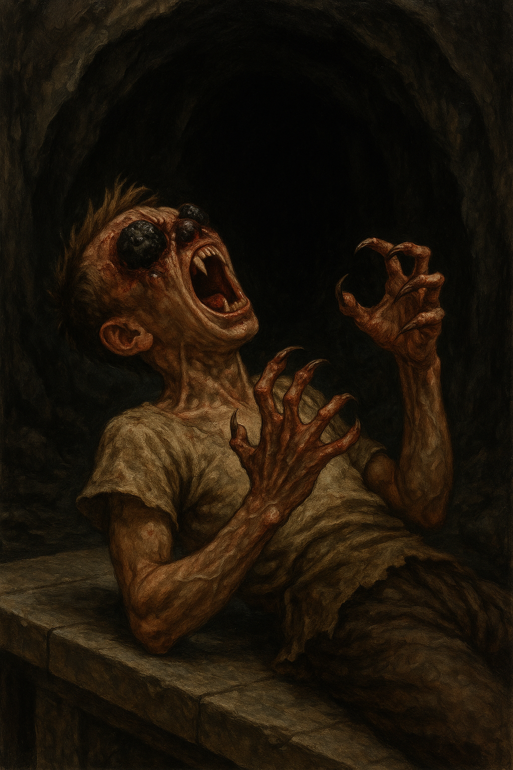 He reached the victim and tried to save the mutilated child. A battle raged around him, a hail of spells, the damned howls of the possessed, the screams of the wounded and dying, among which the healer did not hear the sorcerer he had shot earlier reciting a spell. He realised too late. The boy lying on the altar arched his back with a bloodcurdling scream, his fingers quickly turned into claws, his skin hardened, his teeth turned into fangs, and his eyes burst and turned into black, festering boils.