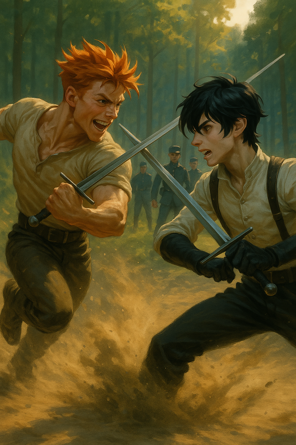 gaze on Kei, who lunged at the vampire with ferocity and delivered a series of blows at a dizzying pace. Forth was completely pushed back into defence, but it was clear that he was planning something. His graceful parries became wider and wider, and the lycanthrope's sword occasionally strayed from its intended path. The vampire was waiting for this. Seeing the cut coming too high, he crouched down and lunged under Kei's guard, aiming his sword at his chest. At the last moment, the lycanthrope bent backwards and performed a backflip almost from a standing position. The shapeshifter landed low on his feet, quickly crouched down and lunged forward again, baring his teeth and resuming his barrage of attacks.
