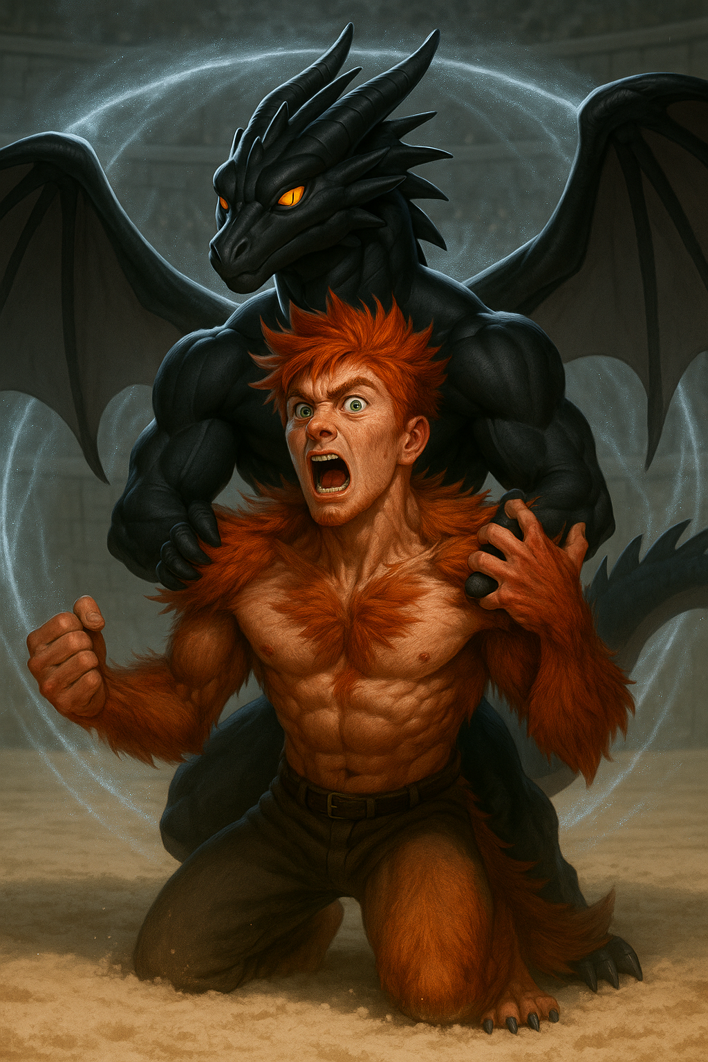 onto the sand of the arena. Draco immediately tightened his grip, to the point where you could hear his muscles tense. The animorph remained motionless for a brief moment, with his arms and head stretched out and immobilised, and then began to thrash chaotically with a dull growl. It looked terrifying. Much worse than the mage could have imagined.