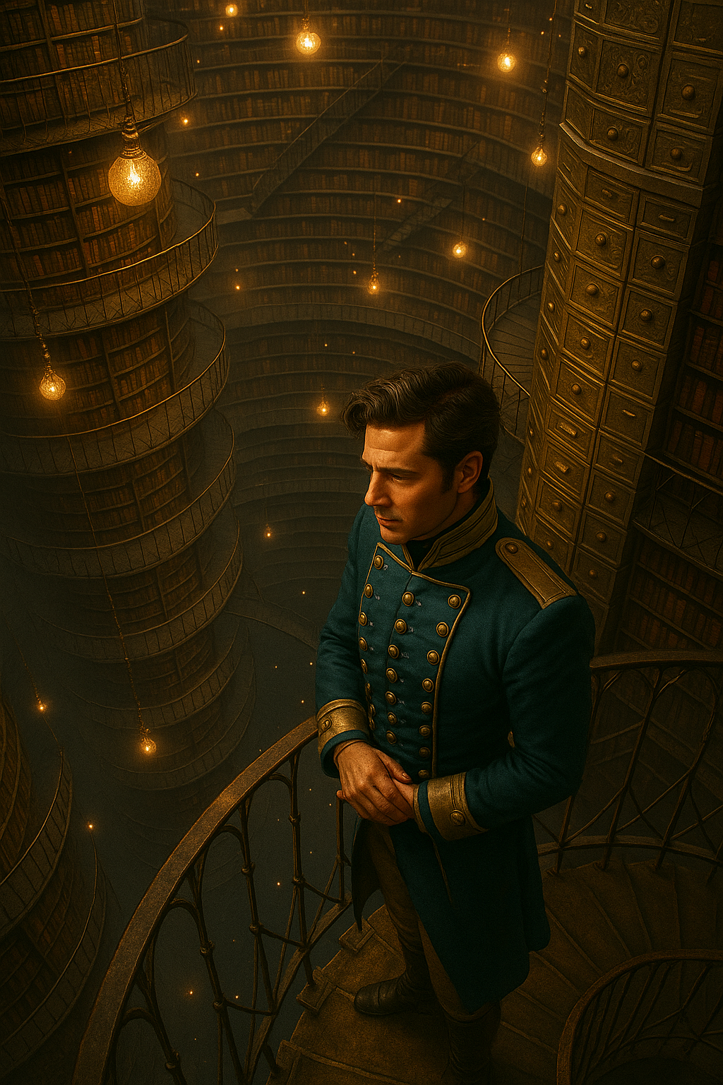 Belist snapped out of his reverie when the monk stopped. They were in the centre of the main floor, if you could call a footbridge hanging over an abyss that. In front of him stood a pillar-shaped bookcase with countless drawers. Stairs wound around the column, stretching up to the ceiling and down to the foundations of the building. On their floor, a high counter was placed around the pillar, behind which stood several priests and priestesses. The monk pointed to a tall, elderly priestess with a stern expression.