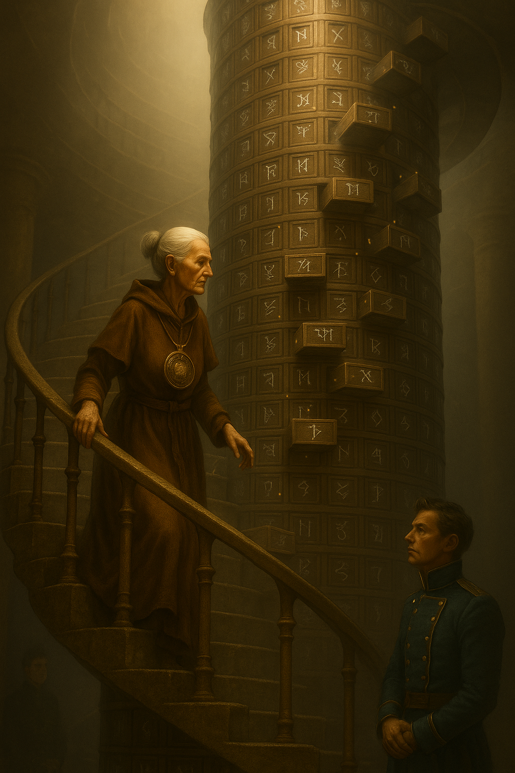 and stared at the column intently for a moment. After a while, she moved up the winding stairs, and Darius had to focus his gaze on her, because it seemed that the drawers in the unusual bookcase were jumping from place to place. The priestess stopped almost two floors higher and confidently reached for a drawer slightly above her head, pulled it out and quickly glanced through several volumes placed there. She took out one of the books and headed back.