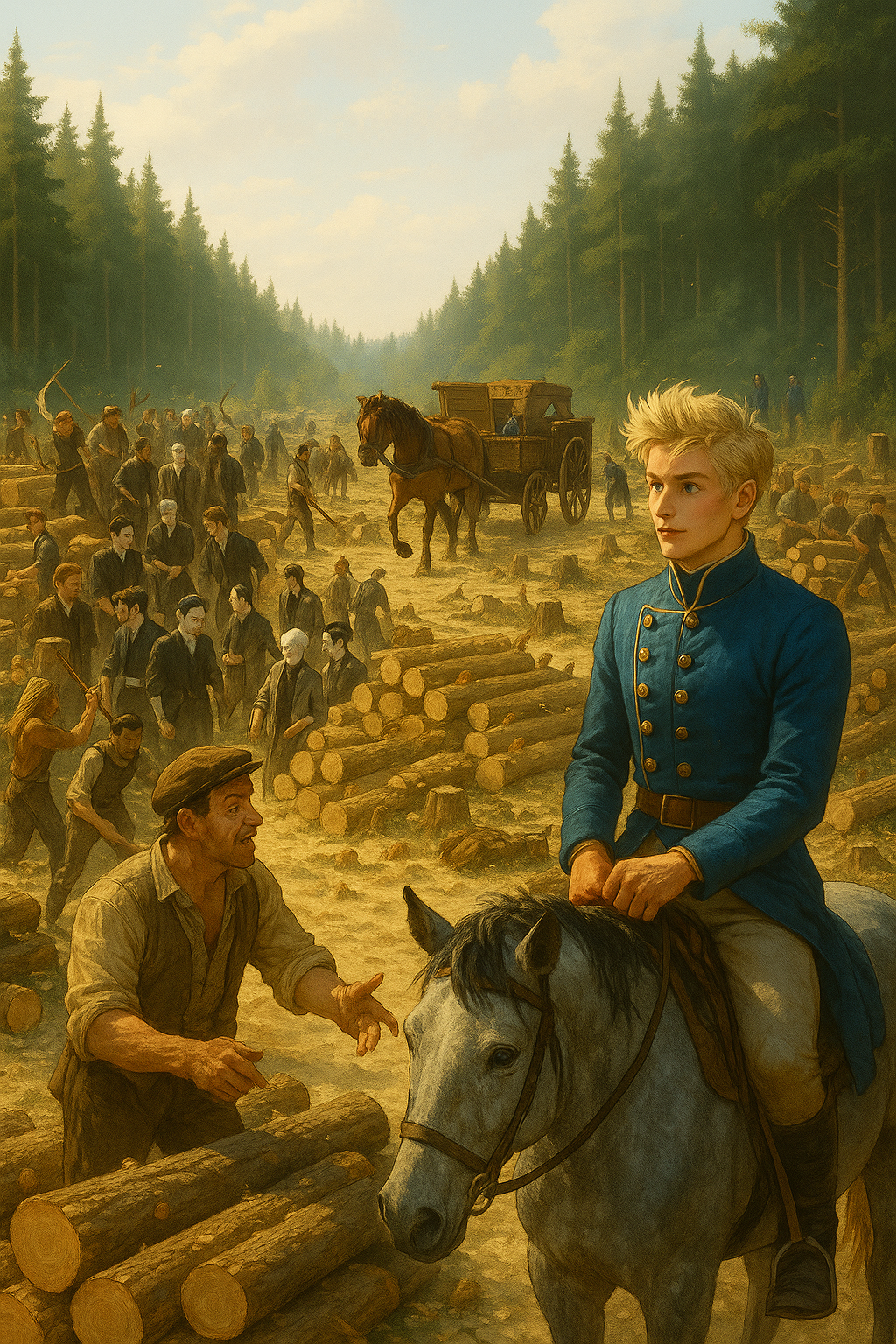 curiosity, trying to see every nook and cranny, which also attracted the attention of the woodcutters. He noticed them watching him several times, but he didn't care and continued his observation. He figured out more or less what everyone was doing, but it remained a mystery to him why some trees were not being cut down but widely avoided. He decided he would have to read up on it. Interestingly, in addition to the loggers, he also noticed soldiers standing not far from the edge of the forest.