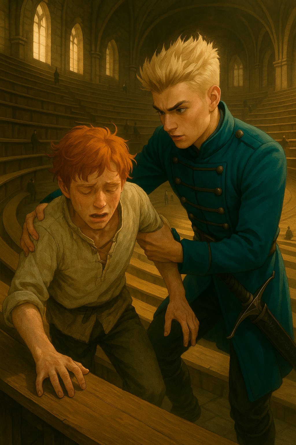 down the now empty row. He only managed to take a few steps before tripping over his own feet. The dragon managed to jump to him before he fell, grab his arm and sit him down on the nearest seat.