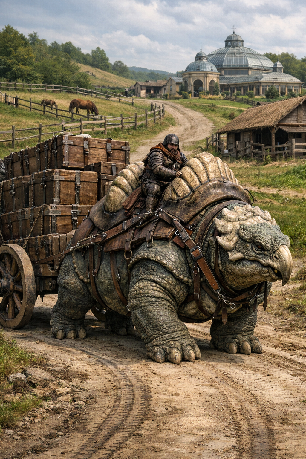 The reptile shook his head and scanned the area, trying to find something interesting that would help him focus on something else. Only from this perspective, walking at the bottom of the valley, did he see that the road he had spotted earlier ran around the main buildings of Solvein. It climbed up the slope behind the Tower to the right of the exit and continued towards the front of the building. Considering that he couldn't see where it ended near the main entrance, it must have led somewhere near the dormitories. In addition, at the top of the plateau, there was a crossroads from which another road led directly to the stables and the glasshouse building. It was marked out a little further away, very close to the paddocks, on a gentler slope. About halfway up, a cart loaded with crates and pulled by a karven was moving uphill. Even from a distance, the silhouette of a massive, lizard-like creature with two humps covered with thick bone plates at the front and back was clearly visible. The wide collar protecting its neck also provided considerable defence. Its short muzzle ended in a curved beak. The creature moved on four short, thick legs resembling those of an elephant. Karvens were used not only as draft animals but also as mounts. The rider sat in a saddle between the humps, which provided excellent protection. Although they were slow, they more than made up for it with the protection they offered.