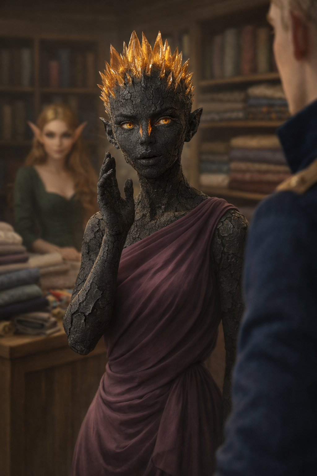 Gizel stopped at the counter, casually looking at the fabrics on display. She looked up when the inner door opened. A short, humanoid creature, reaching perhaps to the dragon's shoulder, entered the shop, dressed in a dress made of a single long strip of heather fabric wrapped around her torso. Her exposed hands and head seemed to be made of charcoal, and instead of hair, she had amber spikes standing upright. The character's eyes, positioned vertically along the slits that served as a nose, had grey whites and honey-coloured irises. Her narrow lips formed a horizontal line and did not move when she spoke. Shehedes scanned Gizel with her gaze.