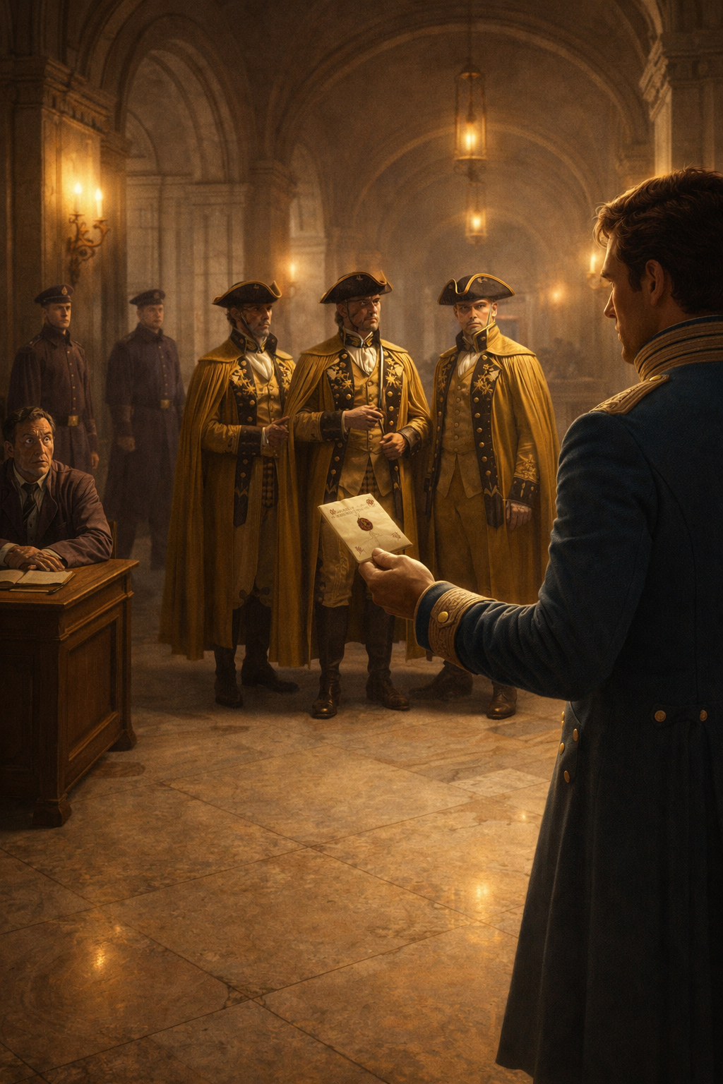 He quickly reached the vestibule, but an unpleasant surprise awaited him there as well. The City Guards stood against the walls, standing at attention as if their lives depended on it. A sleepy clerk stood at attention behind his desk, not daring to move. All this because of the four members of the Golden Guard standing in the middle of the open room. The Guards were talking quietly among themselves, and although they seemed to be fully engrossed in conversation, they watched Darius closely as soon as he came into their field of vision.