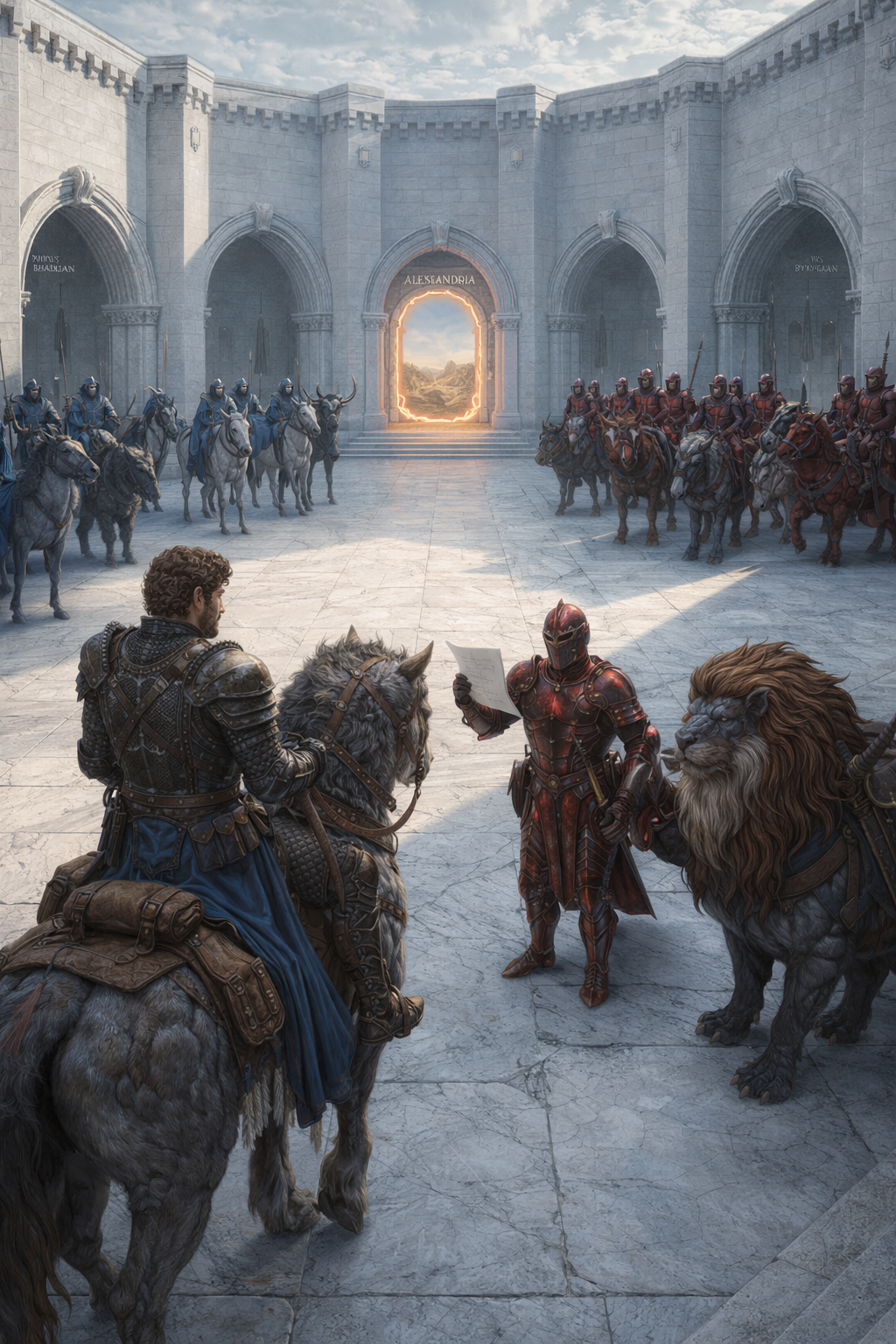 Bleist did not need to look around. From the inner gate, he could see the unit waiting for them. Another surprise today – larger than in the orders Rex had given him. Ten Guardsmen with equipment similar to that of the corporal were waiting near the gate leading to Alexandria, three of them on besses, very likely from Bleist's breeding stock, five on Karsun does – beautiful deer-like beasts with grey-silver coats and graphite antlers and hooves. Their appearance was very deceptive; despite their resemblance to deer, they were carnivorous, and their flattened horns were as sharp as swords. The remaining two rode bikorns - dark-coloured monsters resembling Shire horses, but much stronger and faster than them. A characteristic feature of these mounts were their blood-red eyes and two horns growing from their foreheads in such a way that when the bikorn charged, they were parallel to the ground. Like the Karsun does, the bikorns had a taste for bloody meals, preferably those they had caught and torn apart themselves.