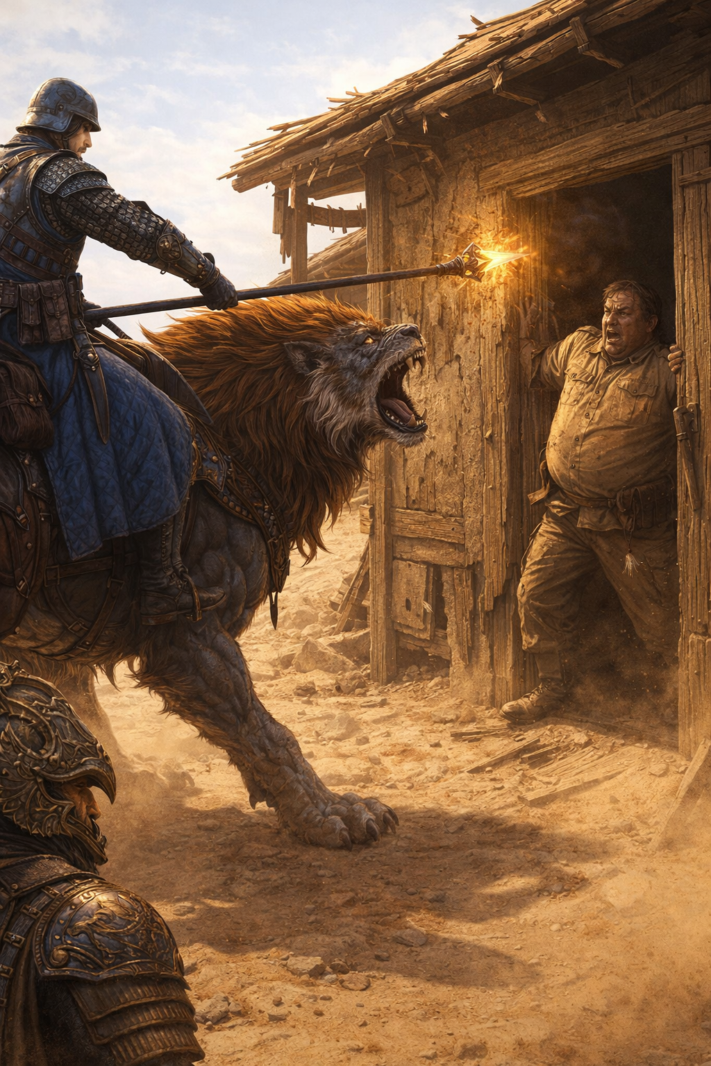 At first, the soldier did not know at whom to direct his anger, cursing and squinting against the glaring sun. Then he saw the chimera standing in front of him and began to back away, but the sight of the rider apparently froze his blood.